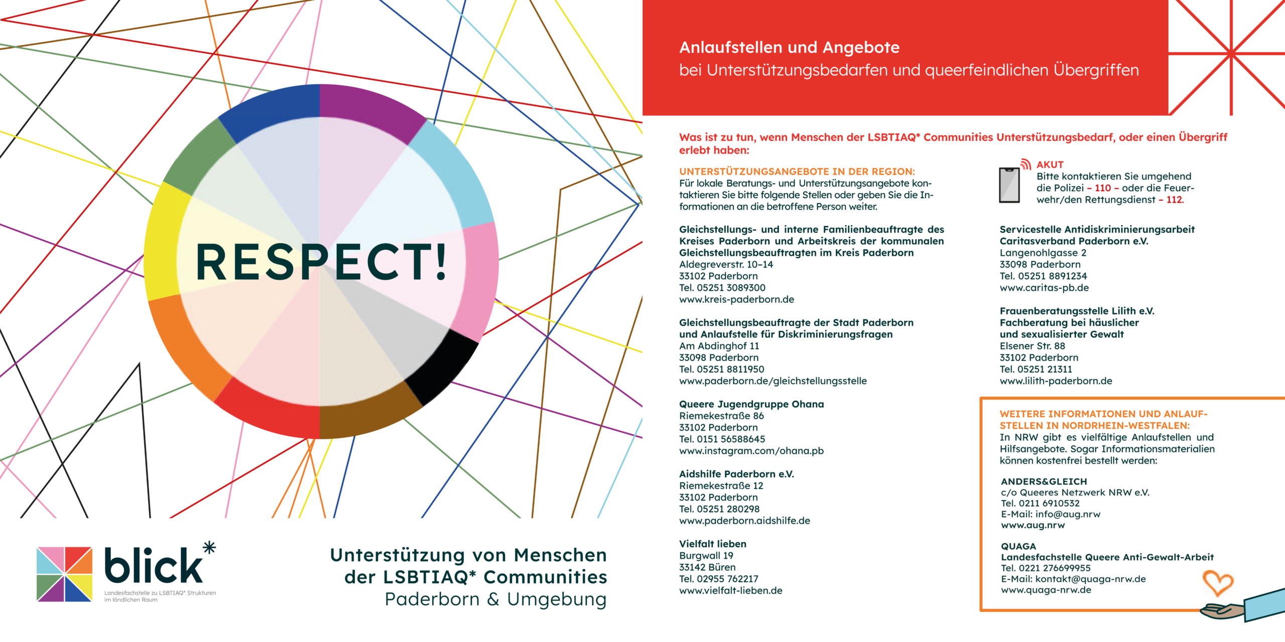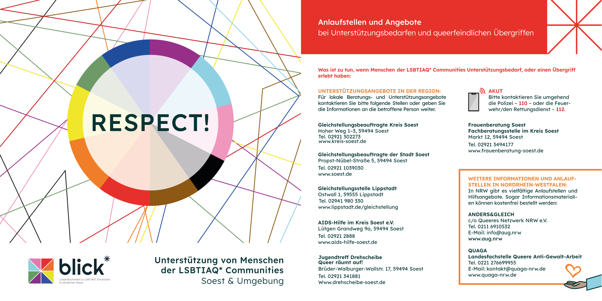 Die RESPECT!-Kampagne ist ein zentraler Pfeiler der Landesfachstelle blick*. Im Mittelpunkt steht der bunte Aufkleber mit dem Wort „RESPECT“, durch den für mehr Sichtbarkeit für lesbische, schwule, bisexuelle, trans*, inter* und queere Personen im ländlichen Raum gesorgt wird. Der RESPECT!-Sticker, der mittlerweile an vielen Eingängen diverser Institutionen angebracht ist, signalisiert: Hier ist ein offener Ort, hier sind queere Menschen willkommen! Dabei werden LSBTIAQ*-freundliche Strukturen und eine nachhaltige Vernetzung in den Kommunen und Kreisen in ganz NRW gefördert.
